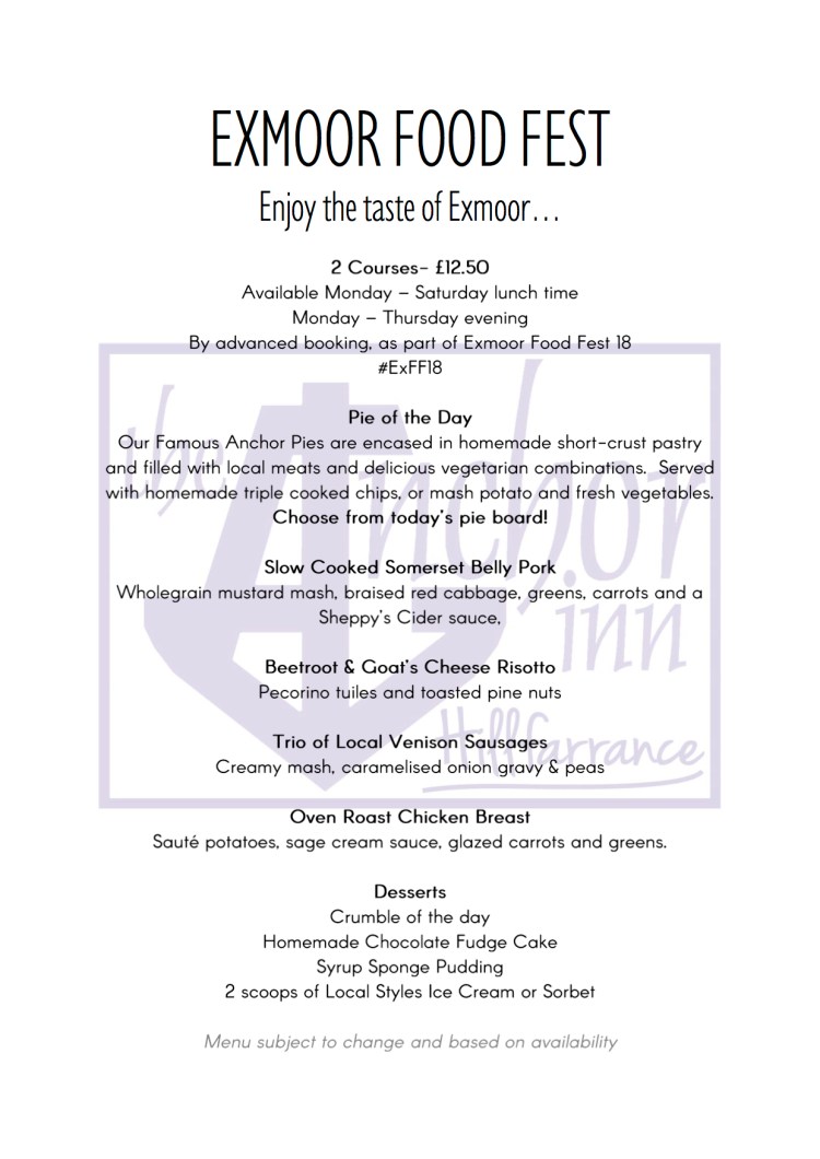 The Anchor Inn, Hillfarrance, have just sent us their menus for the Exmoor Food Fest: