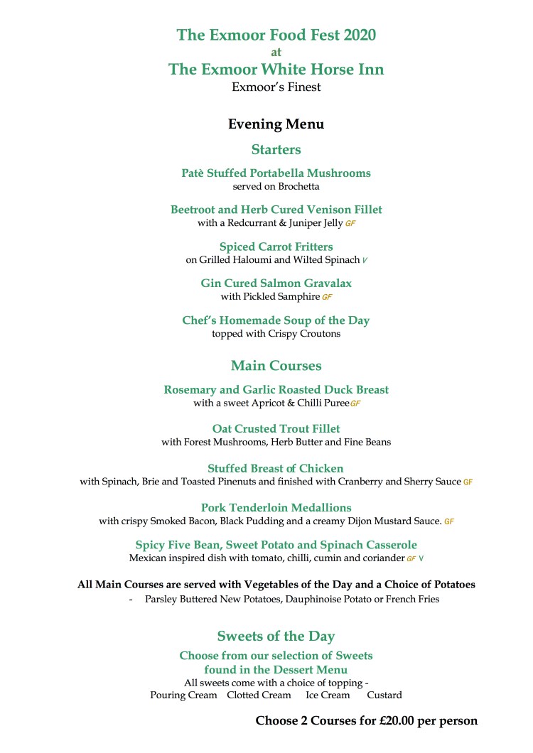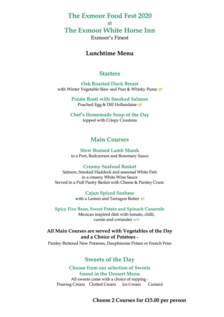 The Exmoor White Horse Inn in Exford are joining us again for the Exmoor Food Fest, and here is what’s on the menu at lunchtime and in the evening: