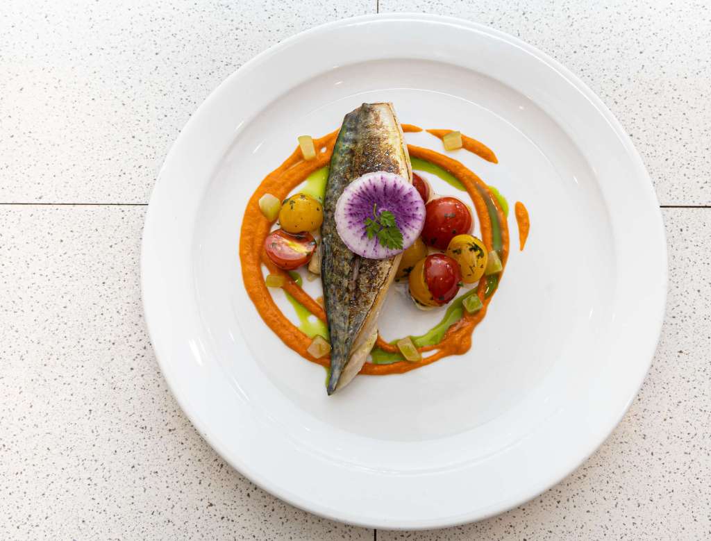 Miguel Tenreiro, who was born in Portugal and grew up in South Africa, is now head chef and general manager of Hotel Porlock Weir. He chose to serve torched mackerel fillet, peri peri dressing, marinated tomatoes and pickled cucumber as nod to his Mediterranean roots.