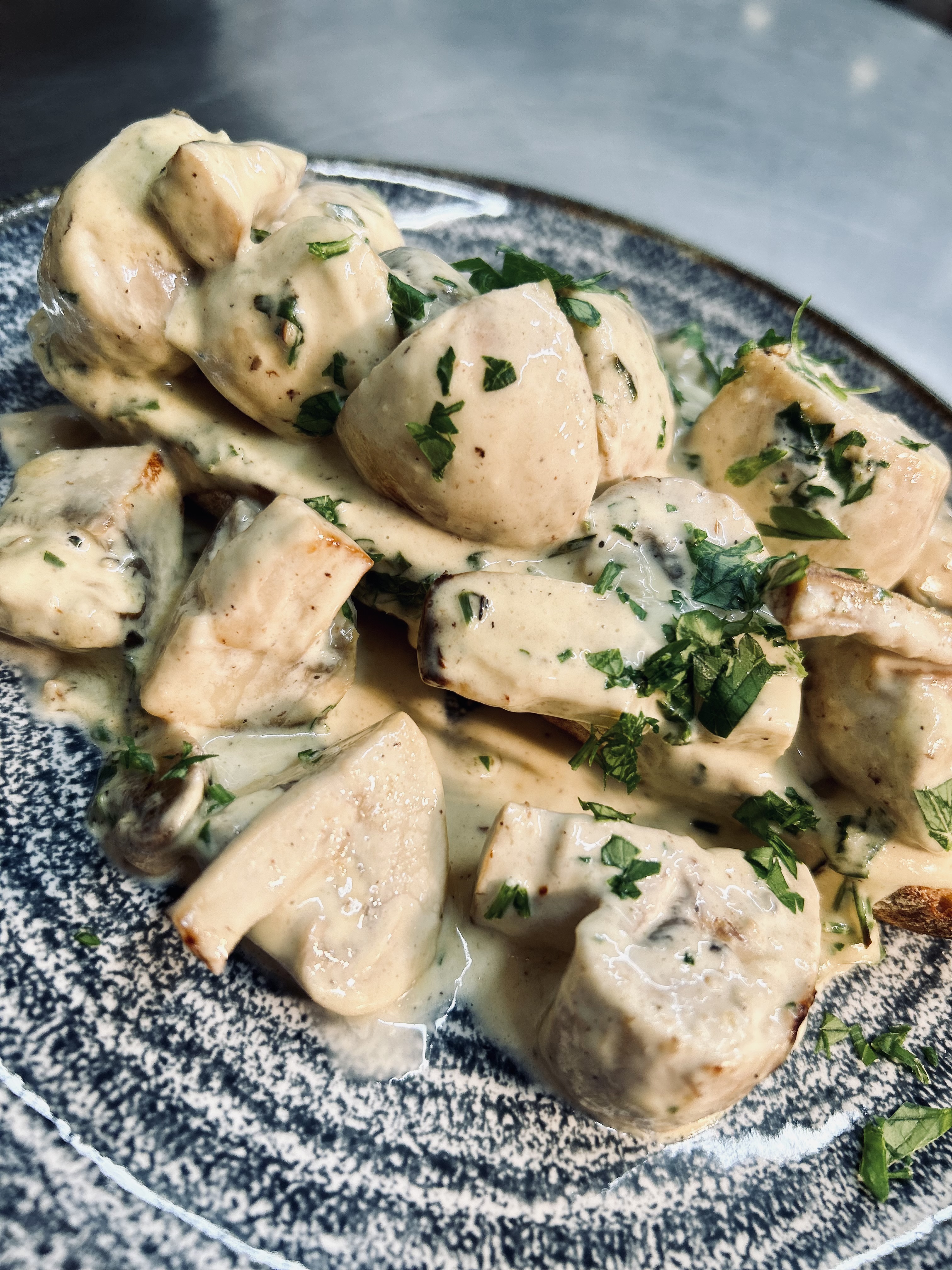 Somerset Chicken (Chicken Breast filled with Somerset Brie, wrapped in bacon) served with Sautee Potatoes and Seasonal vegetables