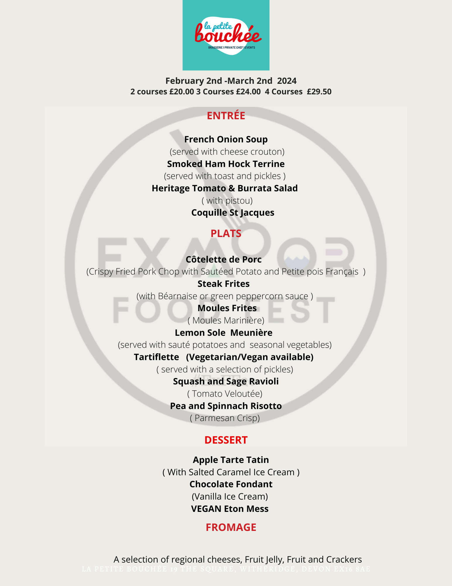 The year has only just begun and already we are on countdown to the Exmoor Food Fest. If you’re not familiar with the food fest, its when groups of restaurants, hotels and bars get together and offer a heavily discounted menu for the month and as ever La Petite Bouchée’s bistro classic favourites are proving very popular.