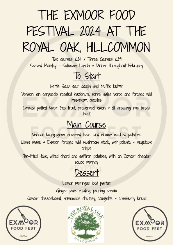 To book please call 01823 401330 or email info@theroyaloakhillcommon.co.uk and quote Exmoor Food Festival.