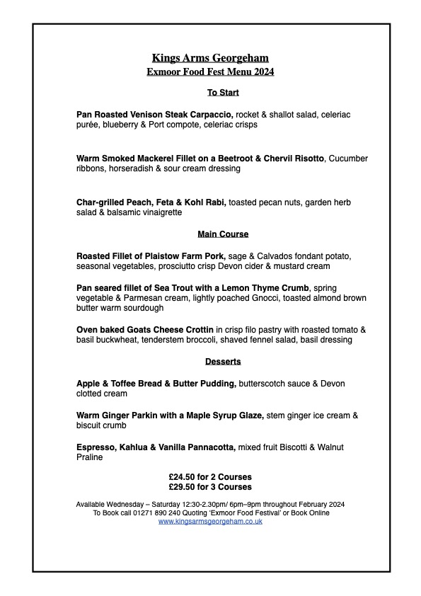 To Book call 01271 890 240 Quoting ‘Exmoor Food Festival’ or Book Online