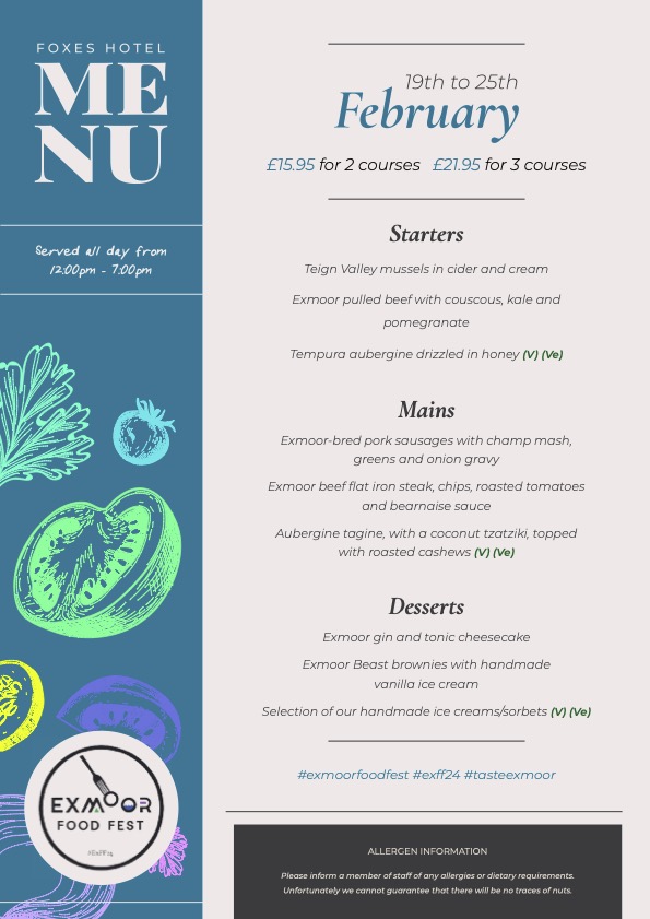 We are delighted to confirm that Foxes Hotel are taking part in this year’s Exmoor Food Festival on the 19th – 25th February.