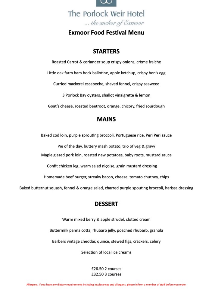 Here is the Exmoor Food Fest menu from The Porlock Weir Hotel!