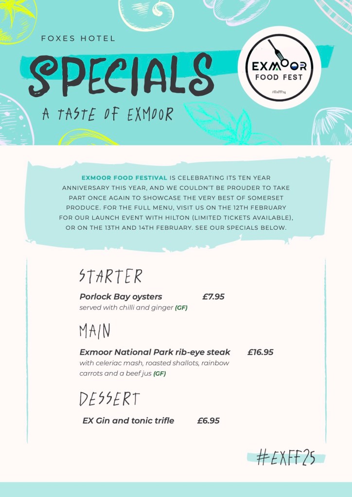 “THE EXMOOR FOOD FEST IS CELEBRATING ITS TEN YEAR ANNIVERSARY, AND SO THIS YEAR, WE ARE LAUNCHING OUR MENU WITH A SPECIAL EVENT TO CELEBRATE THE IMMENSE SUCCESS OF THE LAST DECADE. JOIN US FOR AN UNFORGETTABLE EVENING OF FOOD, DRINK AND LIVE MUSIC, WITH WELCOME DRINKS CREATED BY A HILTON MIXOLOGIST, AND A SPECIAL COLLABORATIVE MENU, CRAFTED BY FOXES HOTEL AND HILTON CHEFS”