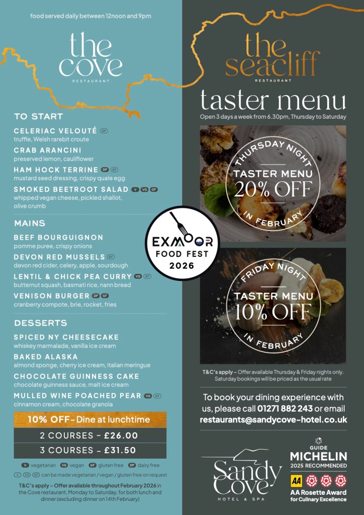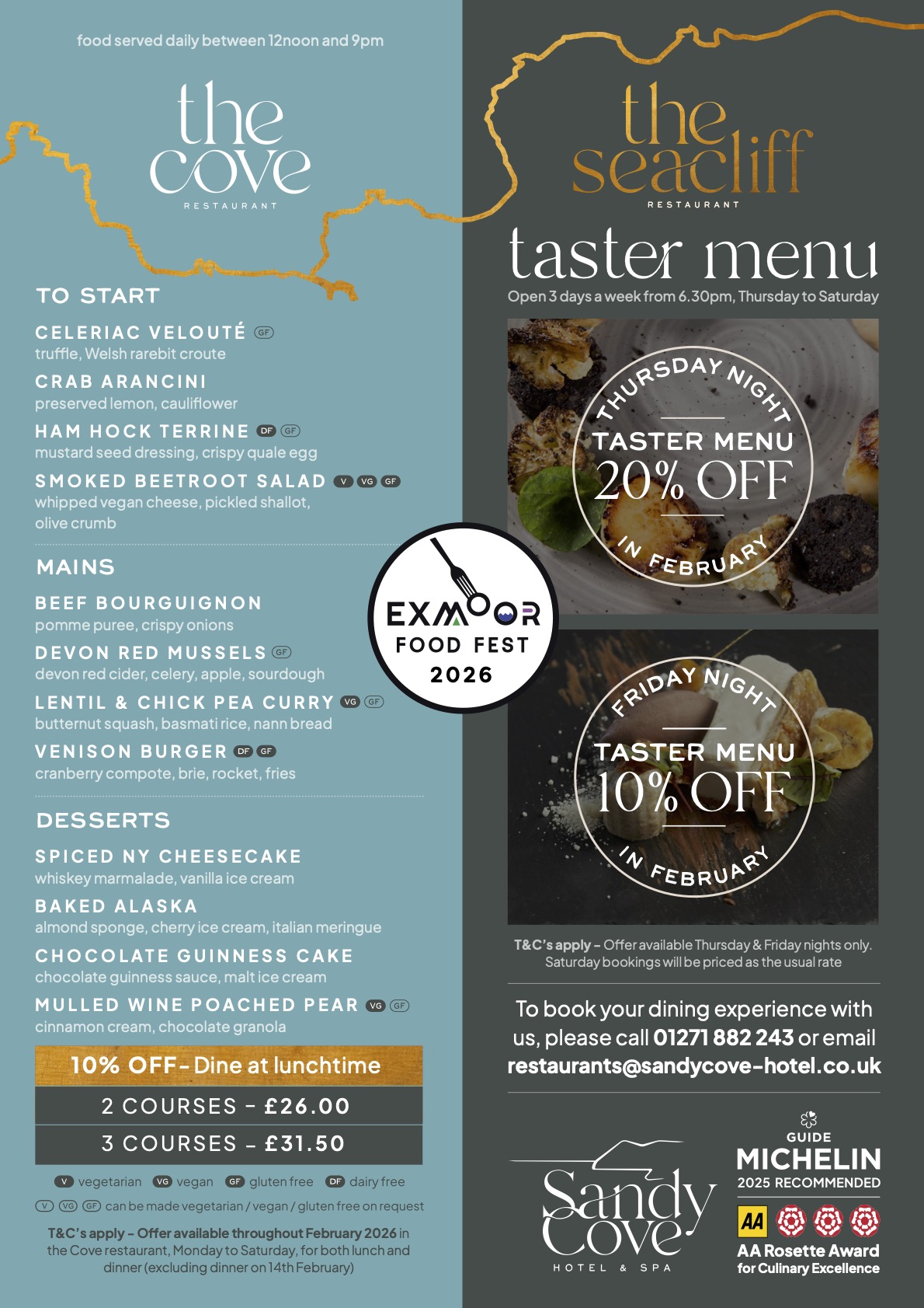 Our award winning dining experiences, with arguably the most dramatic views in the area, are a delight on both your taste and visual senses and with a wine selection to match the carefully selected dishes on this years Exmoor Food Fest menu, we are excited to share with you our choices.